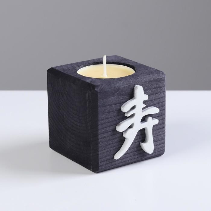 Свеча в деревянном подсвечнике "Куб, Иероглифы. Долголетие", эбен, аромат манго