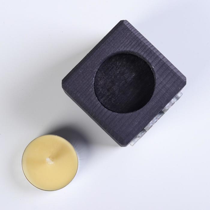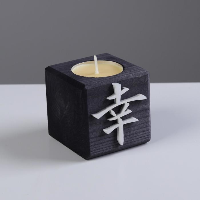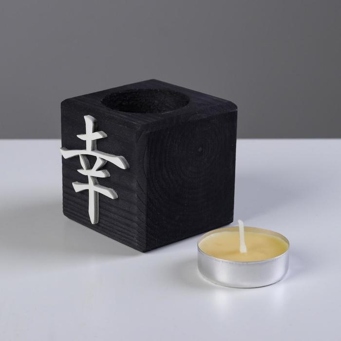 Свеча в деревянном подсвечнике "Куб, Иероглифы. Удача", цвет: "Эбен", 6х6х6 см, аромат манго