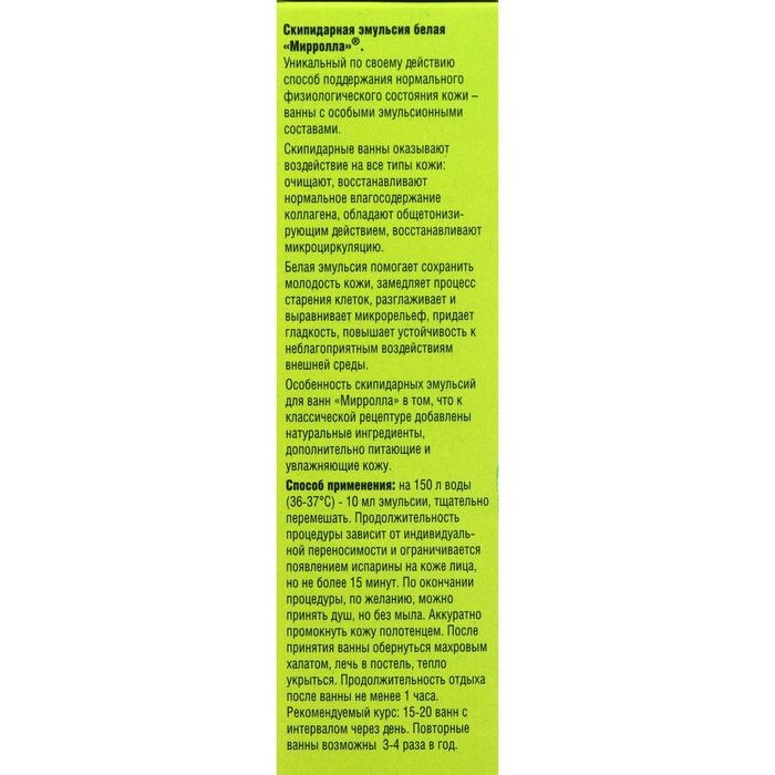Уникальный по своему действию способ поддержания нормального физиологического состояния кожи — ванны с особыми эмульсионными составами. Скипидарные ванны оказывают воздействие на все типы кожи: очищают, восстанавливают нормальное влагосодержание коллагена, обладают общетонизирующим действием, восстанавливают микроциркуляцию. Белая эмульсия помогает сохранить молодость кожи, замедляет процесс старения клеток, разглаживает и выравнивает микрорельеф, придает гладкость, повышает устойчивость к неблагоприятным воздействиям внешней среды. Особенность скипидарных эмульсий для ванн «Мирролла» в том, что к классической рецептуре добавлены натуральные ингредиенты, дополнительно питающие и увлажняющие кожу.
