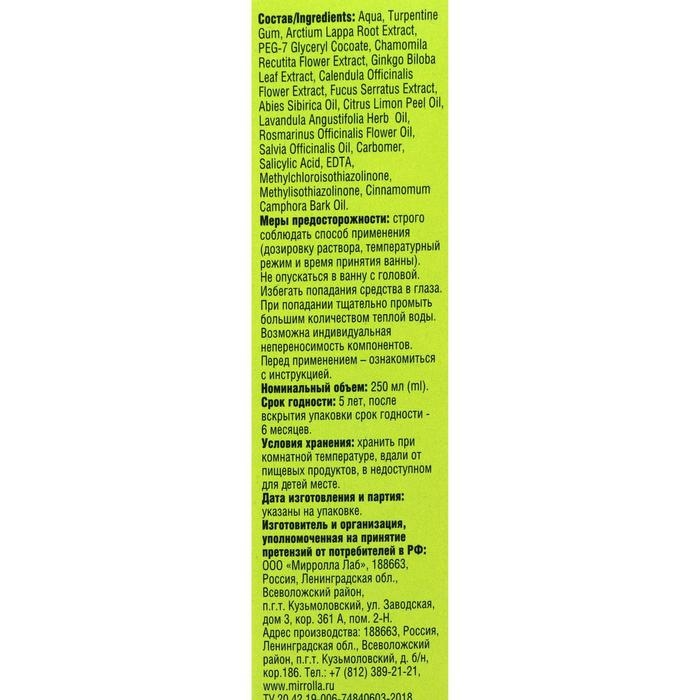 Состав: Aqua, Turpentine Gum, Arctium Lappa Root Extract, PEG-7 Glyceryl Cocoate, Chamomila Recutita Flower Extract, Ginkgo Biloba Leaf Extract, Calendula Officinalis Flower Extract, Fucus Serratus Extract, Abies Sibirica Oil, Citrus Limon Peel Oil, Lavandula Angustifolia Herb Oil, Rosmarinus Officinalis Flower Oil, Salvia Officinalis Oil, Carbomer, Salicylic Acid, EDTA, Methylchloroisothiazolinone, Methylisothiazolinone, Cinnamomum Camphora Bark Oil.