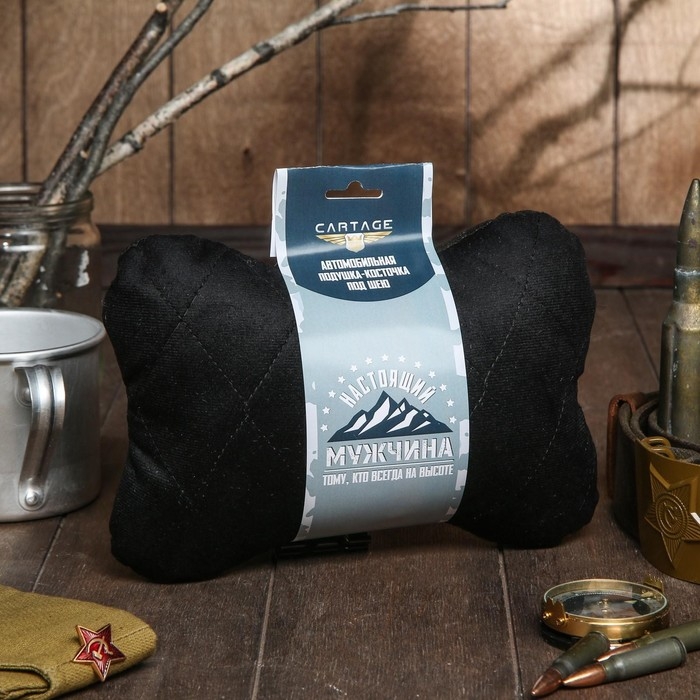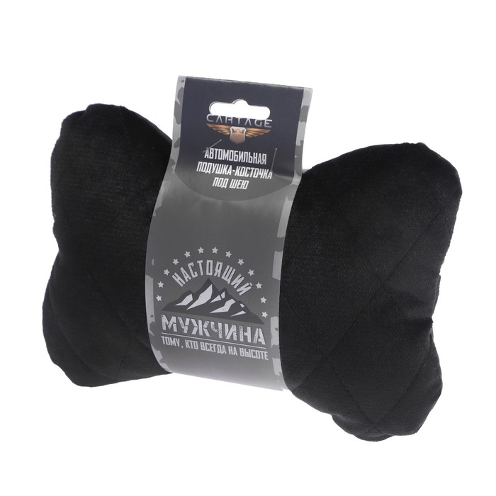 Подушка автомобильная подарочная, косточка, на подголовник, "Настоящему мужчине", велюр, чёрный, 16 х 24 см