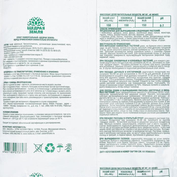 Питательные элементы: Азот – 150 мг/кг; Фосфор – 150 мг/кг; Калий - 150 мг/кг; рН 6-7