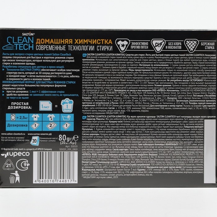 Листы для стирки, SALTON CleanTech для экспресс-стирки цветных тканей, 20 шт
