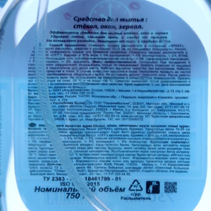 Универсальное средство голубого цвета, создано для мытья зеркальных, стеклянных поверхностей, а именно окон, витрин, автомобильных стекол, хрусталя, зеркал. После применения насухо протереть поверхность бумагой или мягкой тканью.