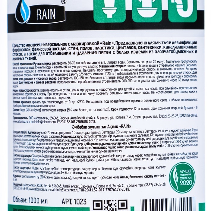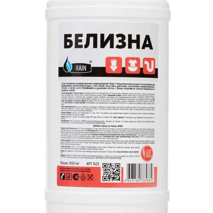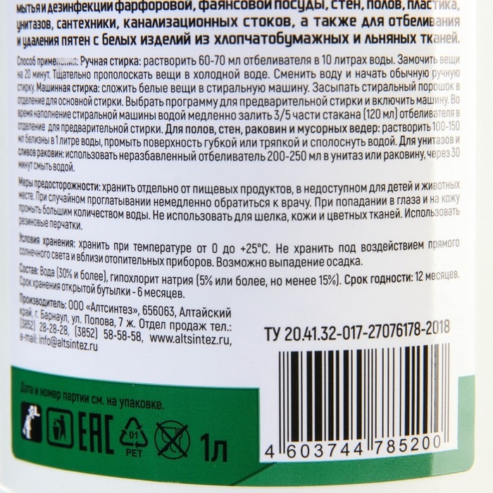 Средство моющее универсальное. Предназначено для мытья и дезинфекции фарфоровой, фаянсовой по суды, стен, полов, пластика, унитазов, сантехники, канализационных стоков, а также для отбеливания и удаления пятен с белых изделий из хлопчатобумажных и льняных тканей.
