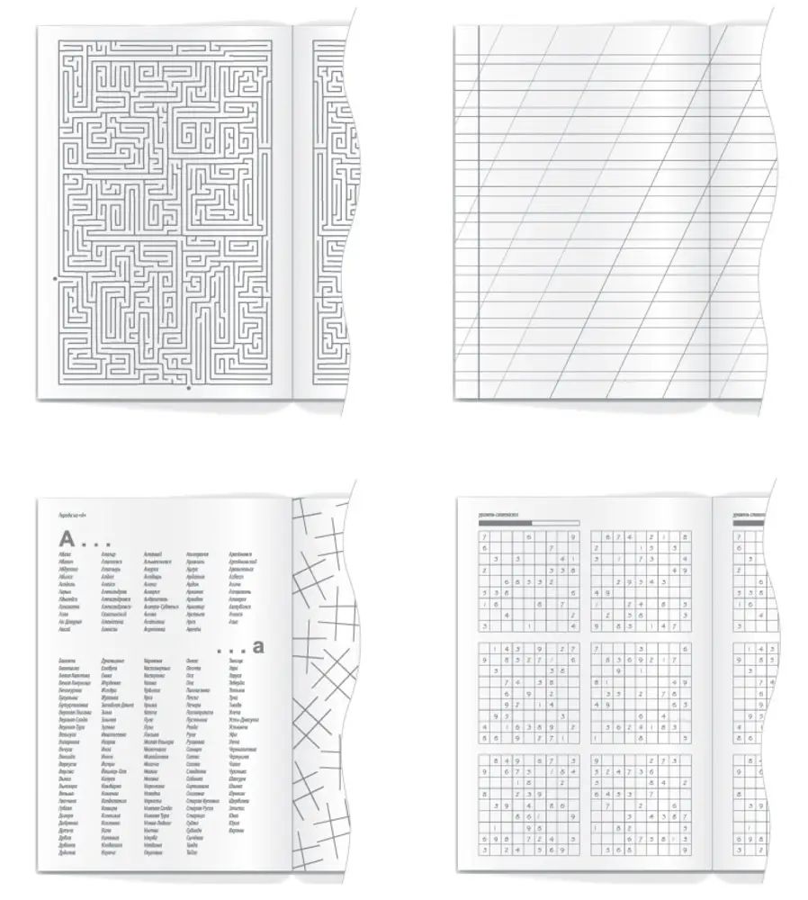 Суровая обложка в стиле industrial скрывает страницы весьма нестандартного блокнота-ежедневника. Внутри — страницы, разлинованные всеми возможными способами; чистые листы и классический набор «бумажных» игр: от морского боя до судоку, а также «листы гнева».