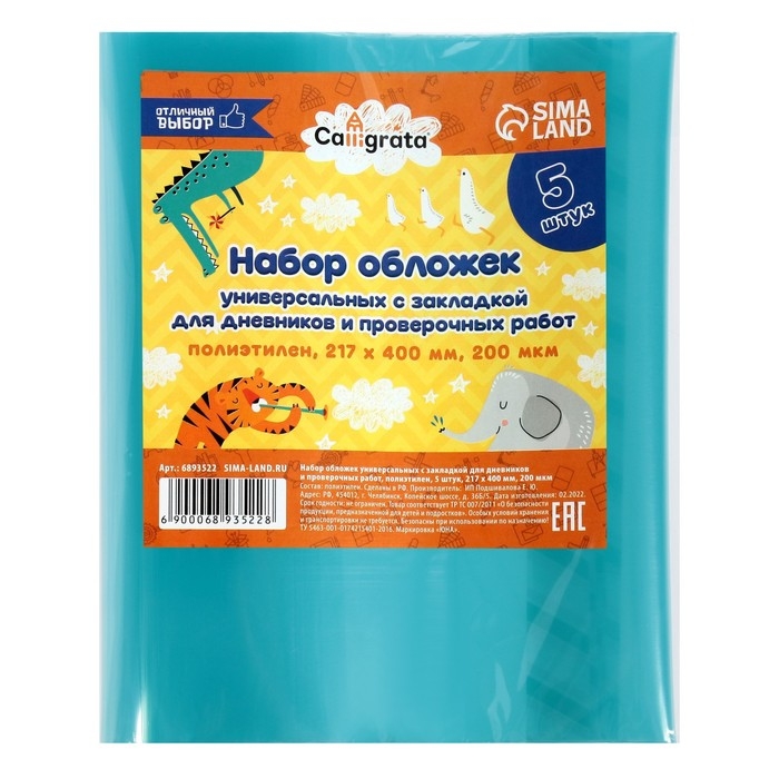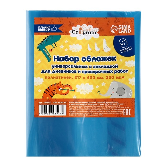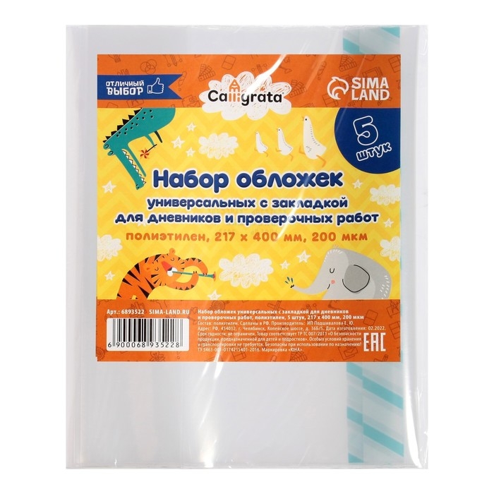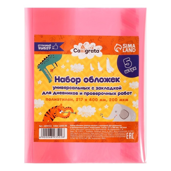 Набор обложек ПЭ 5 штук, 217 х 400 мм, 200 мкм, для дневников и проверочных работ, универсальная, с закладкой, МИКС