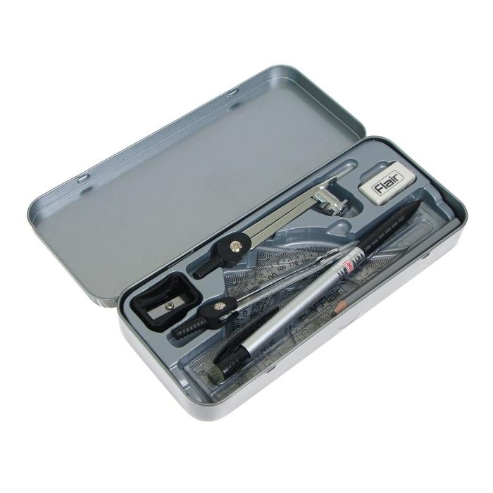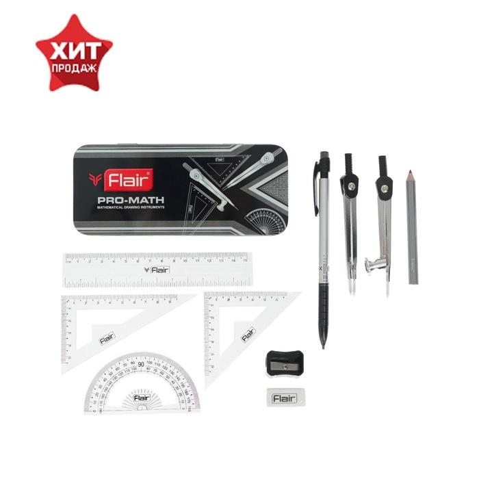 Готовальня FLAIR PRO-MATH 10 предметов (линейка-15см, 2 угольника, транспортир, точилка, ластик, 2 циркуля, карандаш, автоматический карандаш), в металлическом футляре, картонной коробке с европодвесом