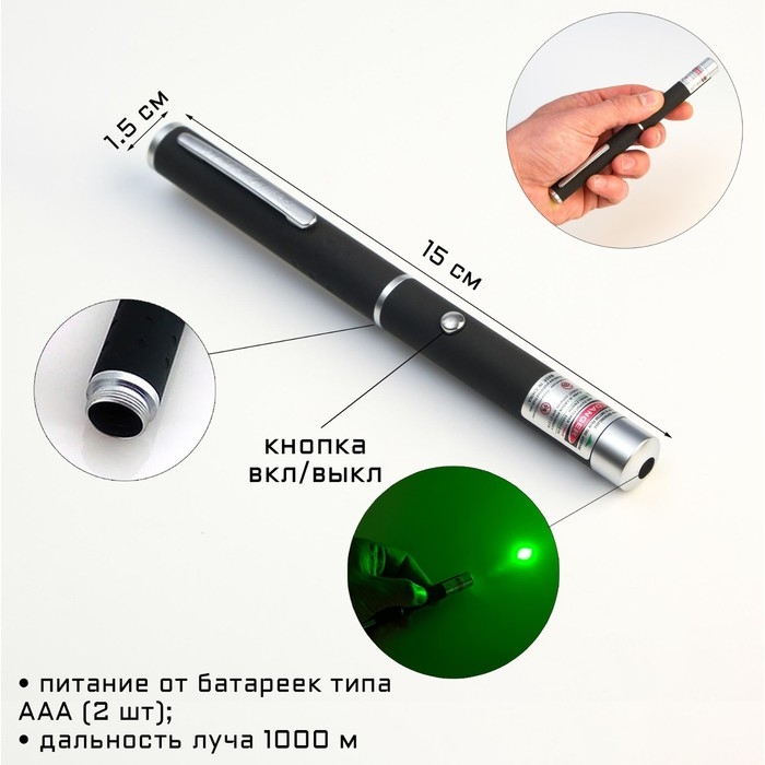 Лазерная указка, дальность 1000 м, 532 нм, 2 ААА, 15 х 1.5 см, зеленый луч