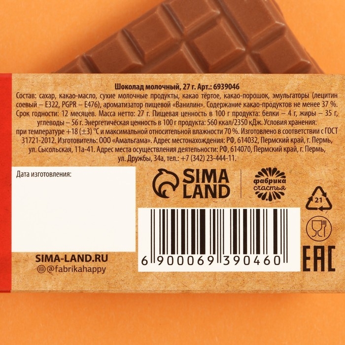 Состав: сухое цельное молоко, какао тёртое, масло какао, сухая молочная сыворотка, обезвоженный молочный жир, сахар, эмульгатор – соевый лецитин, ароматизатор, идентичный натуральному, «Ванилин».