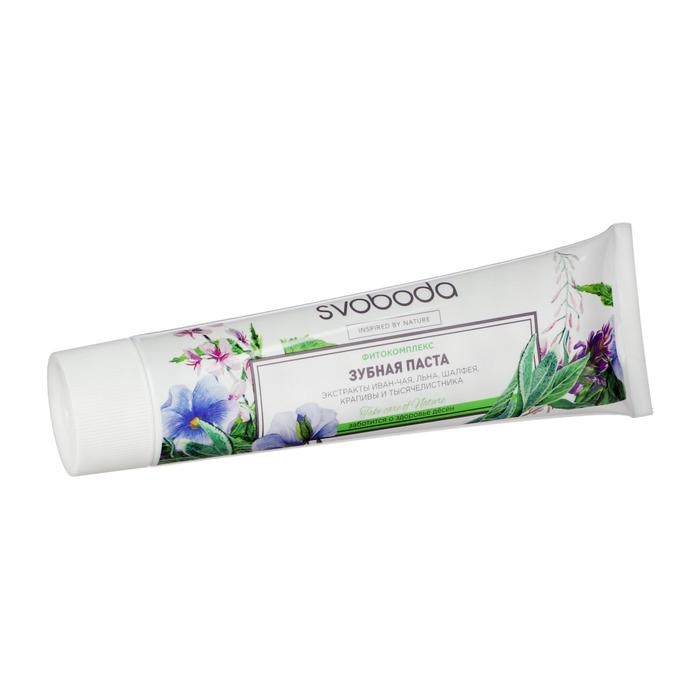 Зубная паста SVOBODA фитокомплекс содержит специально подобранный комплекс целебных трав. Экстракты иван-чая, льна, шалфея, крапивы и тысячелистника заботятся о здоровье десен, укрепляя и питая их комплексом активных веществ. Соединение кальция - источник кальция, необходимого для укрепления ослабленной эмали. 3D Микрочастицы заботятся о чистоте зубов в самых труднодоступных местах. Витамины Е и А, входящие в состав зубной пасты SVOBODA фитокомплекс известны своим антиоксидантным действием.