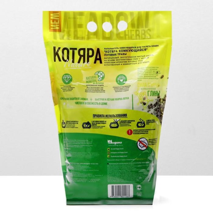 Комкующийся наполнитель "КОТЯРА. Луговые травы" с лёгким приятным ароматом свежести луговых трав имеет полностью натуральный состав из бентонитовых глин.