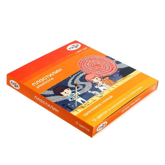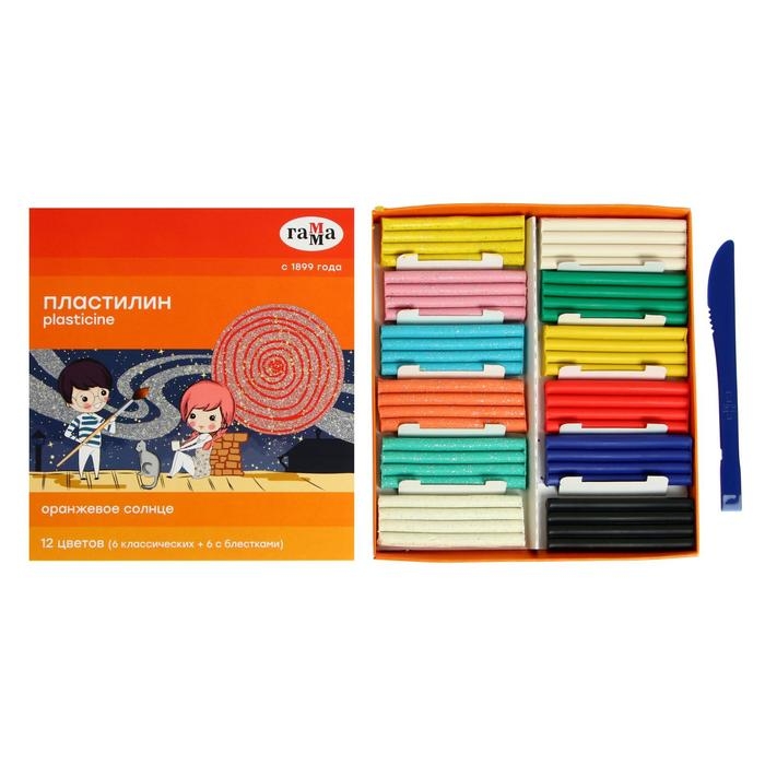 Пластилин 12 цветов 168 г, (6 классических + 6 с блёстками) Гамма "Оранжевое солнце", со стеком, картонная упаковка 130520205