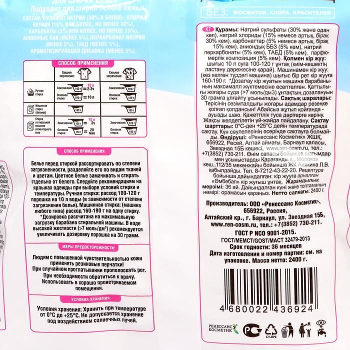 Стиральный порошок содержит активный кислород, который, быстро и эффективно устраняет любые пятна, проникая глубоко в волокна ткани.