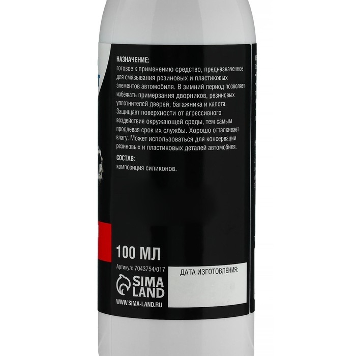 Готовое к применению средство, предназначенное для смазывания резиновых и пластиковых элементов автомобиля. В зимний период позволяет избежать примерзания дворников, резиновых уплотнителей дверей, багажника и капота. Защищает поверхности от агрессивного воздействия окружающей среды, тем самым продлевая срок их службы. Хорошо отталкивает влагу. Может использоваться для консервации резиновых и пластиковых деталей автомобиля.
