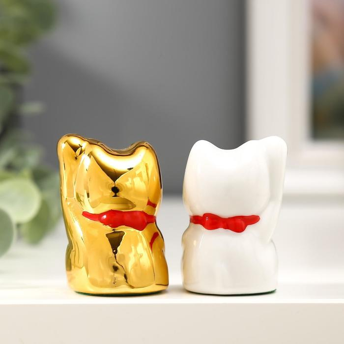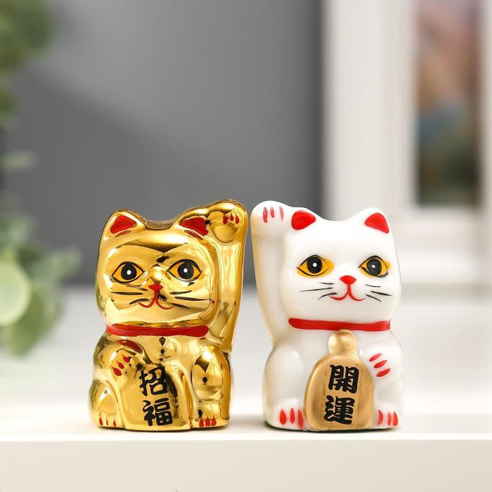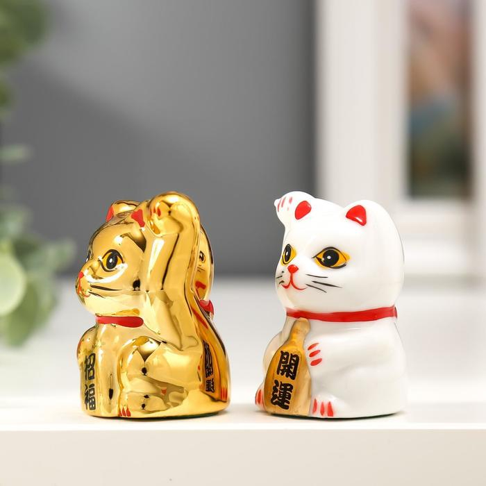 Сувенир керамика "Кот Манэки-нэко белый и золотой" набор 2 шт 5х3,3х3 см