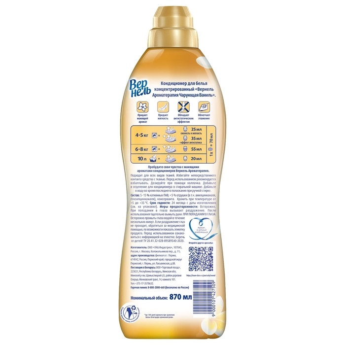 Концентрированный кондиционер для белья Вернель Ароматерапия Чарующая ваниль подарит Вашему белью не только невероятную мягкость, но и магический аромат сладких цветков ванили, а благодаря специальным аромакапсулам в составе кондиционер для стирки Вернель позволит наслаждаться интенсивным ароматом белья до 140 дней.