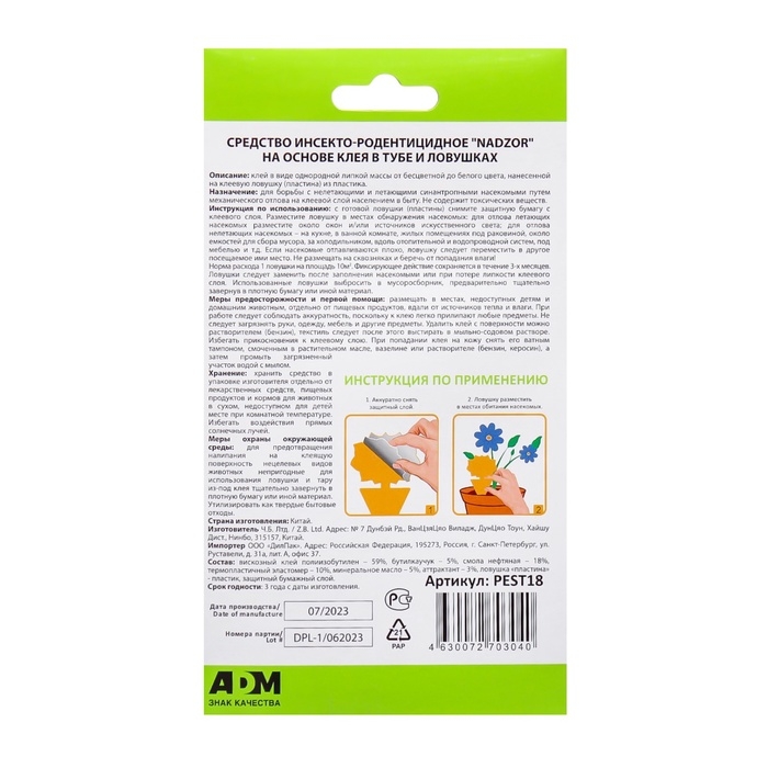 Инструкция использования: снять защитный слой с ловушки и установить в горшок с комнатным растением. Ловушка работает по принципу липкой ленты от мух. Защитный липкий слой работает 3 месяца с момента активации. Ловушки следует заменить после заполнения насекомыми или при потере липкости клеевого слоя. Область применения: для уничтожения комнатных насекомых – вредителей. Ловушка вставляется в горшки с комнатными растениями.