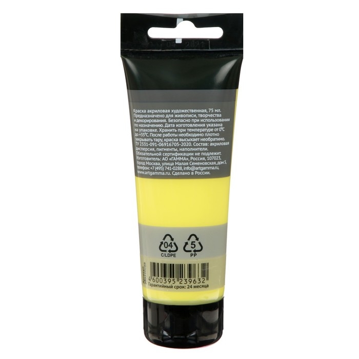 Новая акриловая краска серии «Студия» жёлтого лимонного цвета предназначена для художественно-живописных и декоративно-прикладных работ. Главные отличия: насыщенный цвет, густая консистенция, высокая адгезия, прочность красочного слоя. После высыхания краска становится глянцевой, практически не темнеет, специальная добавка позволяет максимально раскрыть красоту цвета. Художественный акрил прекрасно разносится, подходит для бумаги, картона, грунтованного холста, дерева, стекла, кожи, ткани. Время высыхания: от 10 минут до 1 часа в зависимости от толщины слоя. Прозрачный корпус тубы позволяет увидеть цвет краски, а удобная крышка флип-топ предотвращает высыхание. Объём тубы — 75 мл.