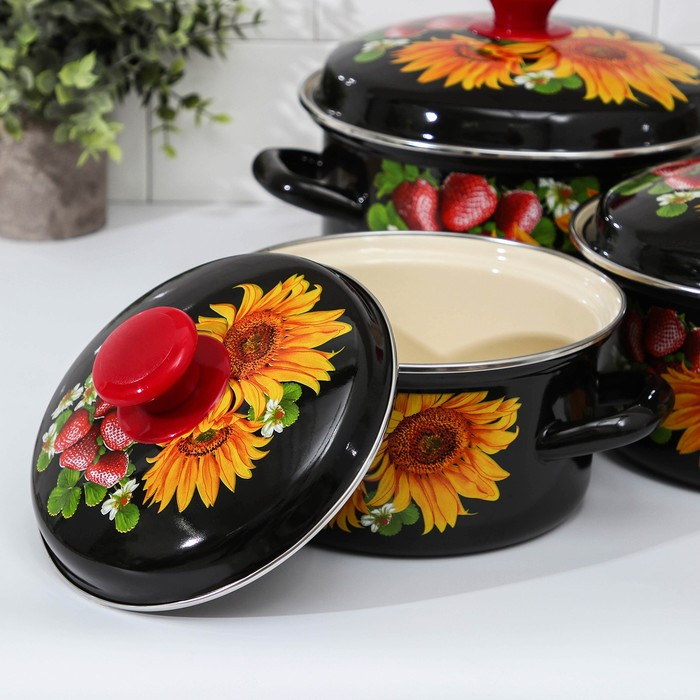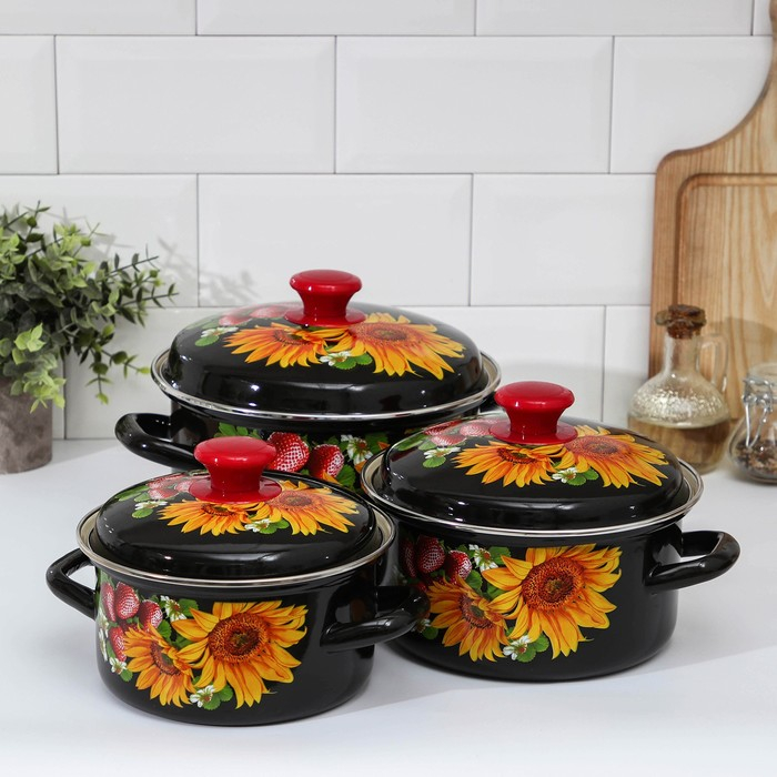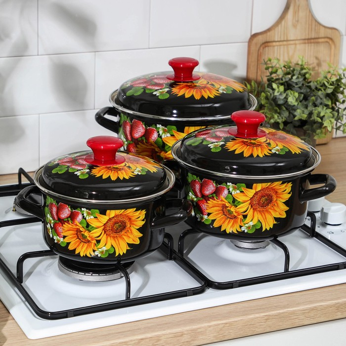 Набор эмалированных кастрюль «Китайская роза», 3 предмета: 1,5 л, 2 л, 3 л, индукция