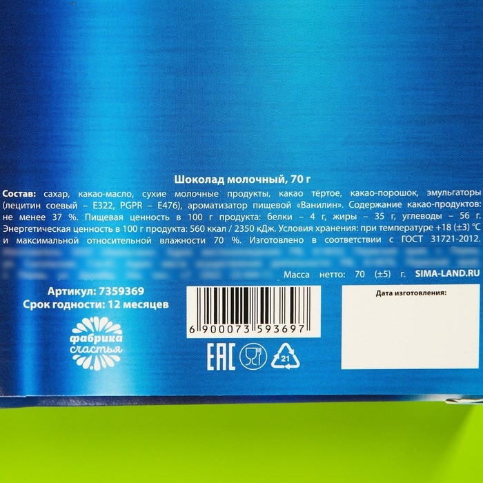 Состав: сахар, какао-масло, сухие молочные продукты, какао тёртое, какао-порошок, эмульгаторы (лецитин соевый – Е322, PGPR – Е476), ароматизатор пищевой «Ванилин». Содержание какао продуктов – не менее 37 %.