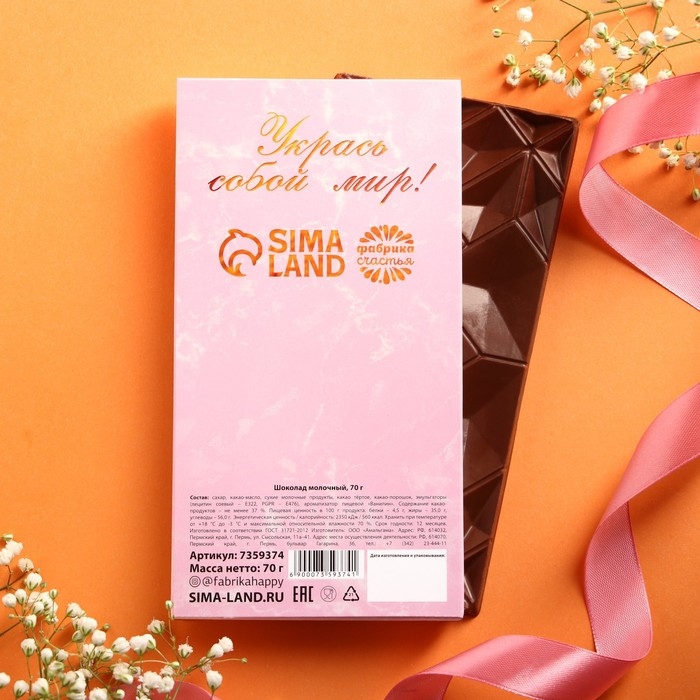Состав: сахар, какао-масло, сухие молочные продукты, какао тёртое, какао-порошок, эмульгаторы (лецитин соевый – Е322, PGPR – Е476), ароматизатор пищевой «Ванилин». Содержание какао продуктов – не менее 37 %.