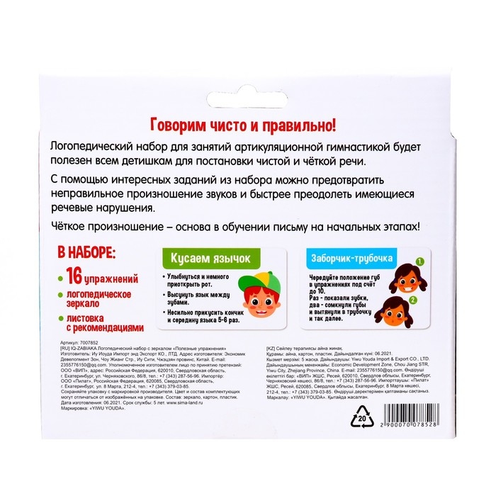 В наборе представлено 16 упражнений, логопедическое зеркало, листовка с рекомендациями.