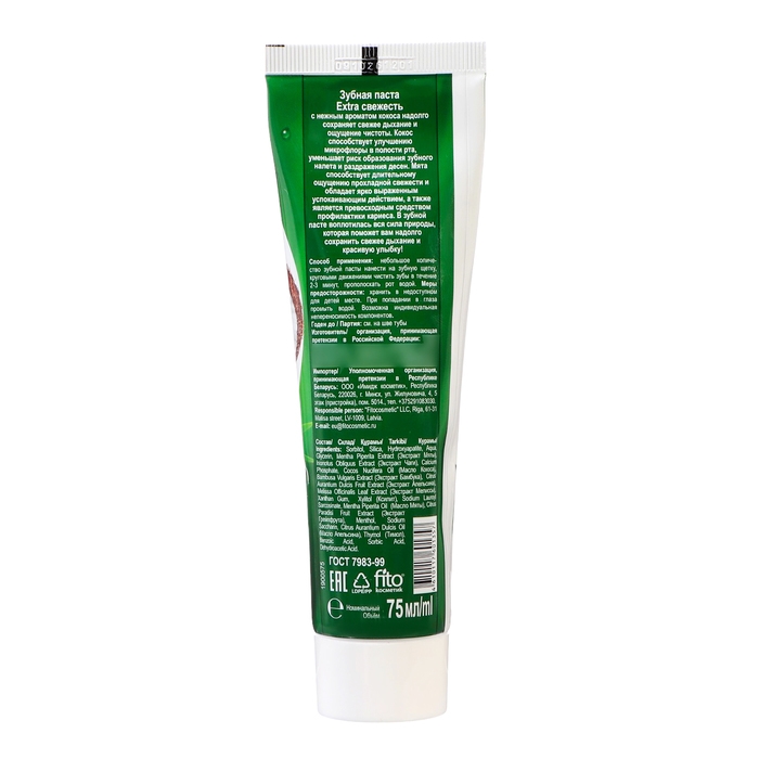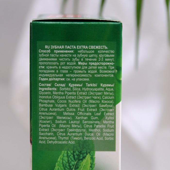 Состав: sorbitol, Silica, Hydroxyapatite, Aqua, Glycerin, Mentha Piperita Extract (Экстракт Мяты), Inonotus Obliquus Extract (Экстракт Чаги), Calcium Phosphate, Cocos Nucifera Oil (Масло Кокоса), Bambusa Vulgaris Extract (Экстракт Бамбука), Citrus Aurantium Dulcis Fruit Extract (Экстракт Апельсина), Melissa Officinalis Leaf Extract (Экстракт Мелисcы), Xanthan Gum, Xylitol (Ксилит), Sodium Lauroyl Sarcosinate, Mentha Piperita Oil (Масло Мяты), Citrus Paradisi Fruit Extract (Экстракт Грейпфрута), Menthol, Sodium Saccharin, Citrus Aurantium Dulcis Oil (Масло Апельсина), Thymol (Тимол), Benzoic Acid, Sorbic Acid, Dehydroacetic Acid.
