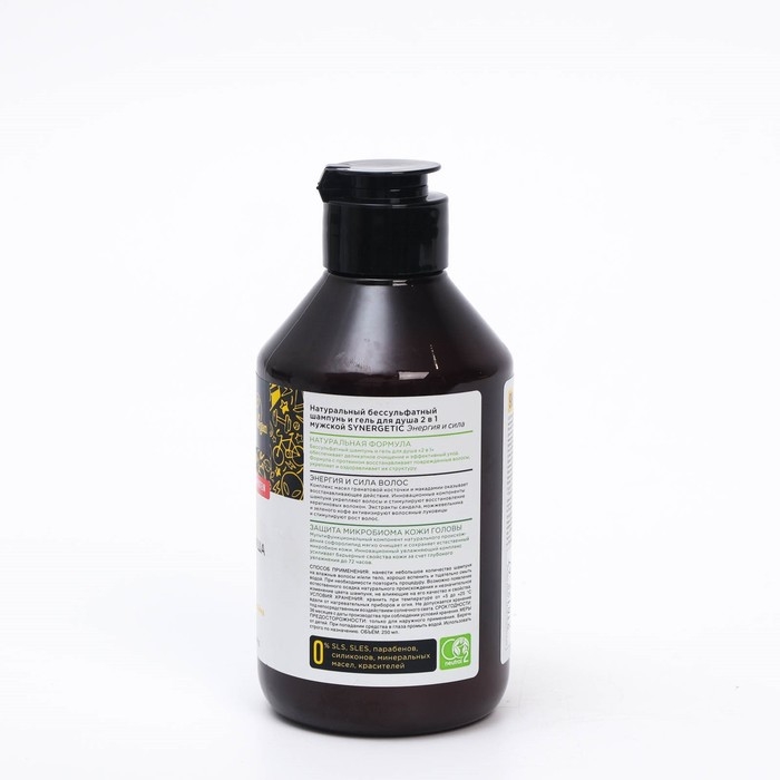 Натуральный бессульфатный шампунь и гель для душа 2 в 1 мужской SYNERGETIC "Энергия и сила" - эффективное средство для очищения тела, кожи головы и всех типов волос. Бессульфатный шампунь и гель для душа "2 в 1" обеспечивает деликатное очищение и эффективный уход. Формула с протеином восстанавливает поврежденные волосы, укрепляет и оздоравливает их структуру. Комплекс масел гранатовой косточки и макадамии, который оказывает восстанавливающее действие. Инновационные компоненты шампуня укрепляют волосы и стимулируют формирование кератиновых волокон. Экстракты сандала, можжевельника и зеленого кофе активизируют волосяные луковицы и стимулируют рост волос. Мультифункциональный компонент натурального происхождения софоролипид мягко очищает кожу головы и сохраняет естественный микробиом кожи. Нанести небольшое количество шампуня на влажные волосы и/или тело, хорошо вспенить и тщательно смыть водой. При необходимости повторить процедуру. Возможно появление естественного осадка натурального происхождения и незначительное изменение цвета шампуня, не влияющие на его качество и свойства. Только для наружного применения. Беречь от детей. При попадании средства в глаза промыть водой. Использовать строго по назначению. Aqua; Lauryl Glucoside; Sodium Lauroyl Methyl Isethionate; Cocamidopropyl Betaine; Candida Bombicola/Glucose/Methyl Rapeseedate Ferment; Lauroyl/Myristoyl Methyl Glucamide; Inulin (растительный пребиотик); Macadamia Seed Oil Polyglyceryl-4 Esters (масло макадамии); Pumpkin Seed Oil Polyglyceryl-4 Esters (масло тыквенных семечек); Olive Oil Polyglyceryl-4 Esters (масло оливы); Cymbopogon Citratus Extract (экстракт лемонграсса); Plumeria Alba Flower Extract (экстракт франжипани); Glycerin; Coco Glucoside; Glyceryl Oleate; Sodium Cocoyl Isethionate; Triticum Vulgare (Wheat) Protein; Saccharide Isomerate; Hydroxypropylgluconamide; Hydroxypropylammonium Gluconate; Glycol Distearate; Glyceryl Stearate; Persea Gratissima Oil (масло авокадо); Guar Hydroxypropyltrimonium Chloride; Sodium Chloride; Sodium Benzoate; Parfum; Tetrasodium Glutamate Diacetate; Sodium Citrate.