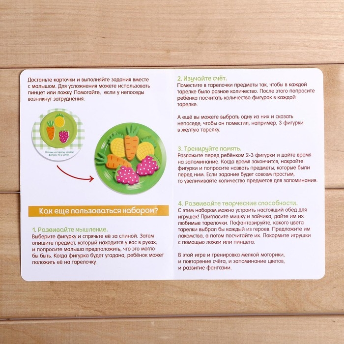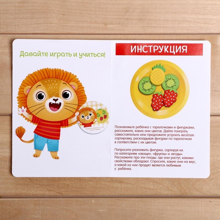 Внутри набора ребёнок найдёт тарелочки и яркие фигурки овощей, фруктов, ягод и карточки с заданиями. Все занятия способствуют развитию мелкой моторики, речи, усидчивости и внимания малыша. Ребёнок запомнит цвета, освоит счёт.
