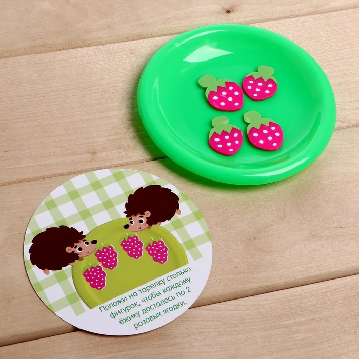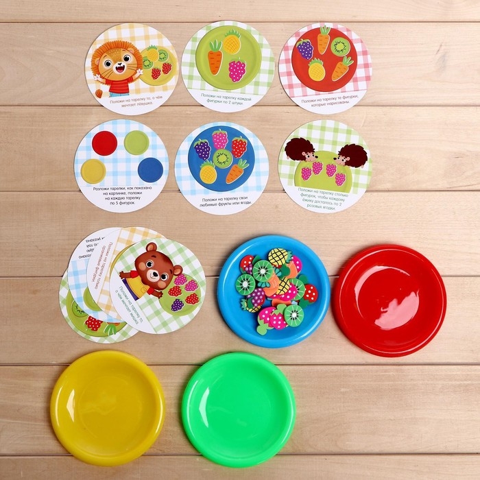 В наборе: 30 ярких резиновых фигурок, 20 заданий на карточках, 4 цветные тарелочки.