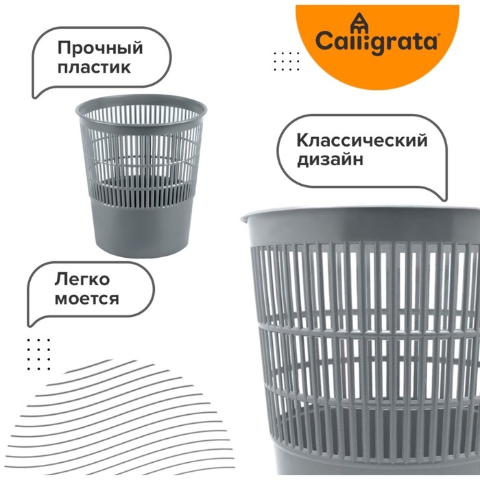 Корзина для бумаг и мусора 10 литров, Сalligrata "Доступный офис", пластик, сетчатая, серая