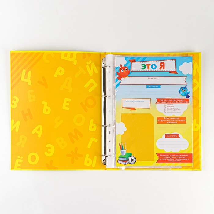 В набор входит: папка на кольцах и 14 вкладышей. Обложка выполнена из переплетного картона плотностью 1,5 мм, внутри есть четыре кольца, на которые следует цеплять файлы.