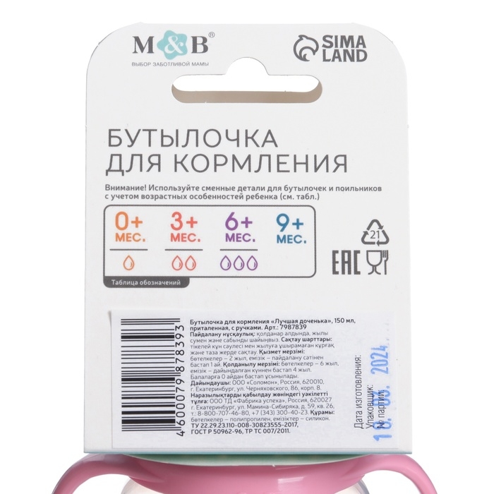Бутылочка для кормления «Наше сокровище», классическое горло, приталенная, с ручками, 150 мл., от 0 мес., цвет бирюзовый