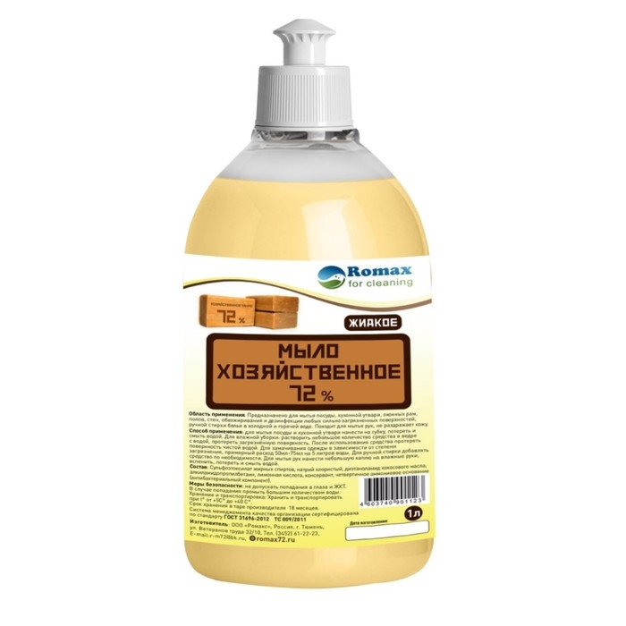 Жидкое хозяйственное мыло 72% Romax — это высококонцентрированное средство для решения различных бытовых задач.