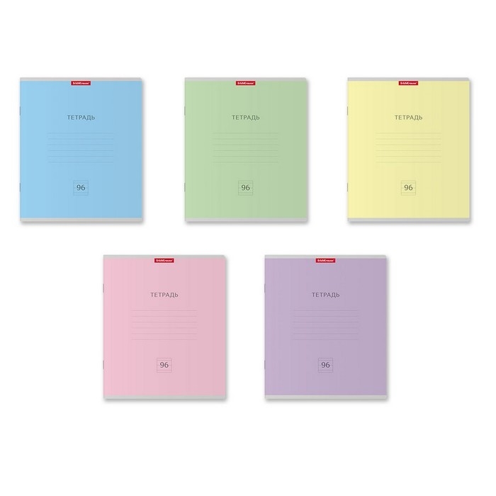 Тетрадь общая формата А5+ (170 х 203 мм). Обложка из высококачественного мелованного картона плотностью 190 г/м2. В блоке 96 листов в линейку с полями. Бумага офсетная плотностью 60 г/м2. Цвет линовки - синий. Скругленные уголки обложки и блока. Тип скрепления - скоба. Тетради разных цветов упакованы в термоусадочную пленку по 5 штук.