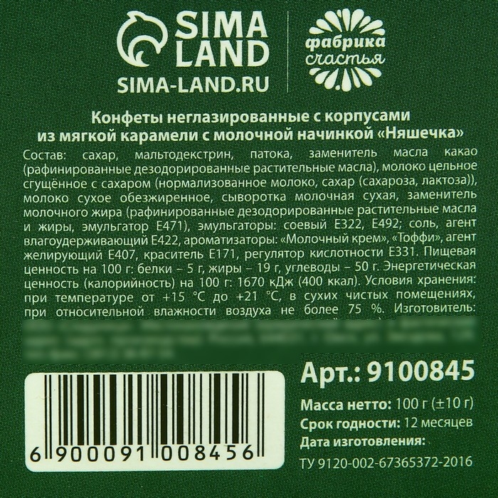 Состав: сахар, мальтодекстрин, патока, заменитель масла какао (рафинированные дезодорированные растительные масла), молоко цельное сгущённое с сахаром (нормализованное молоко, сахар (сахароза, лактоза)), молоко сухое обезжиренное, сыворотка молочная сухая, заменитель молочного жира (рафинированные дезодорированные растительные масла и жиры, эмульгатор Е471), эмульгаторы: соевый Е322, Е492; соль, агент влагоудерживающий Е422, ароматизаторы: «Молочный крем», «Тоффи», агент желирующий Е407, краситель Е171, регулятор кислотности Е331.