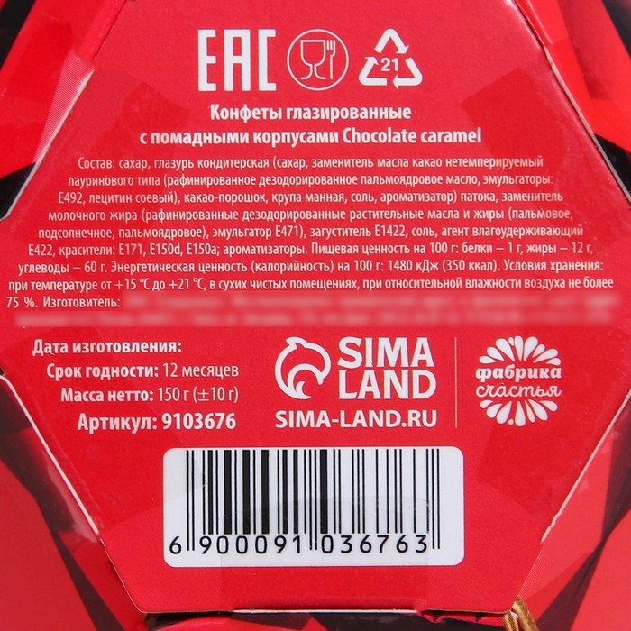 Состав: сахар, глазурь кондитерская (сахар, заменитель масла какао нетемперируемый лауринового типа (рафинированное дезодорированное пальмоядровое масло, эмульгаторы: Е492, лецитин соевый), какао-порошок, крупа манная, соль, ароматизатор) патока, заменитель молочного жира (рафинированные дезодорированные растительные масла и жиры (пальмовое, подсолнечное, пальмоядровое), эмульгатор Е471), загуститель Е1422, соль, агент влагоудерживающий Е422, красители: Е171, Е150d, Е150а; ароматизаторы.