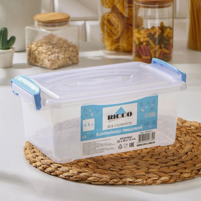 Контейнер пищевой RICCO, 4,5 л, 32×20×12 см, прямоугольный, цвет прозрачный, ручки голубые