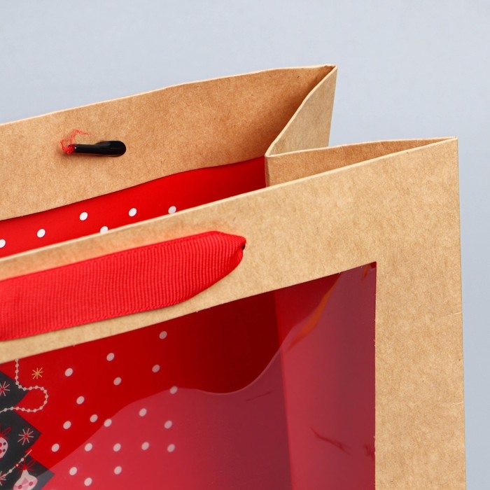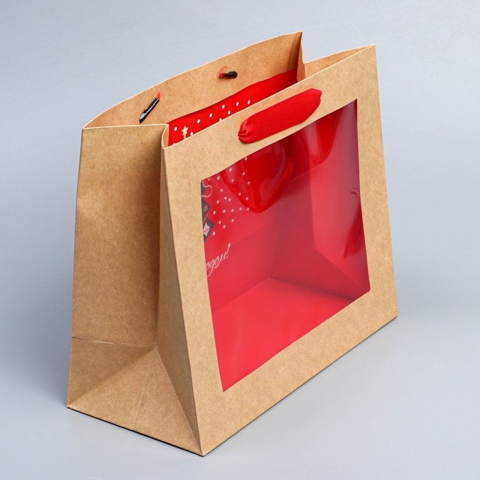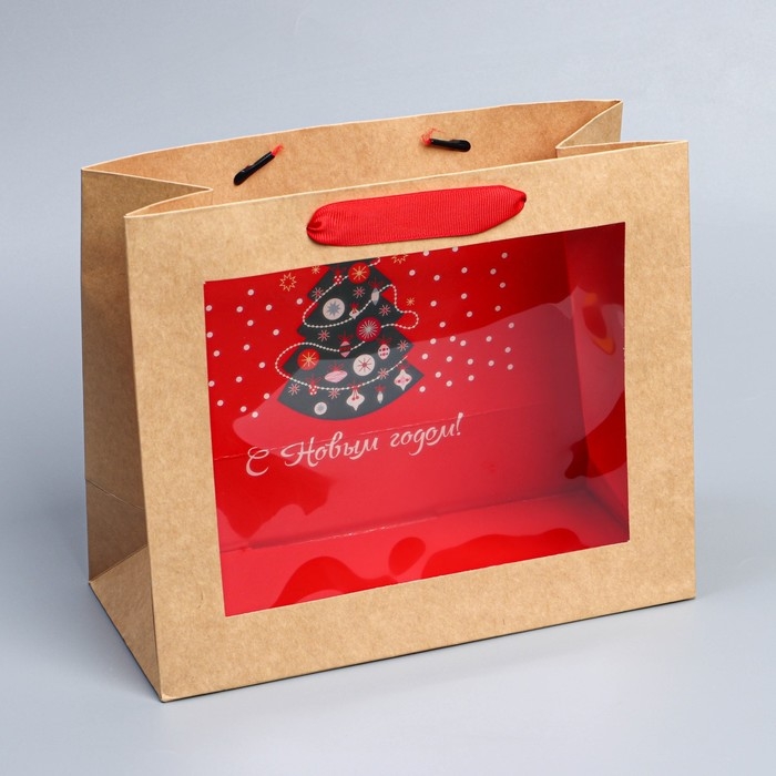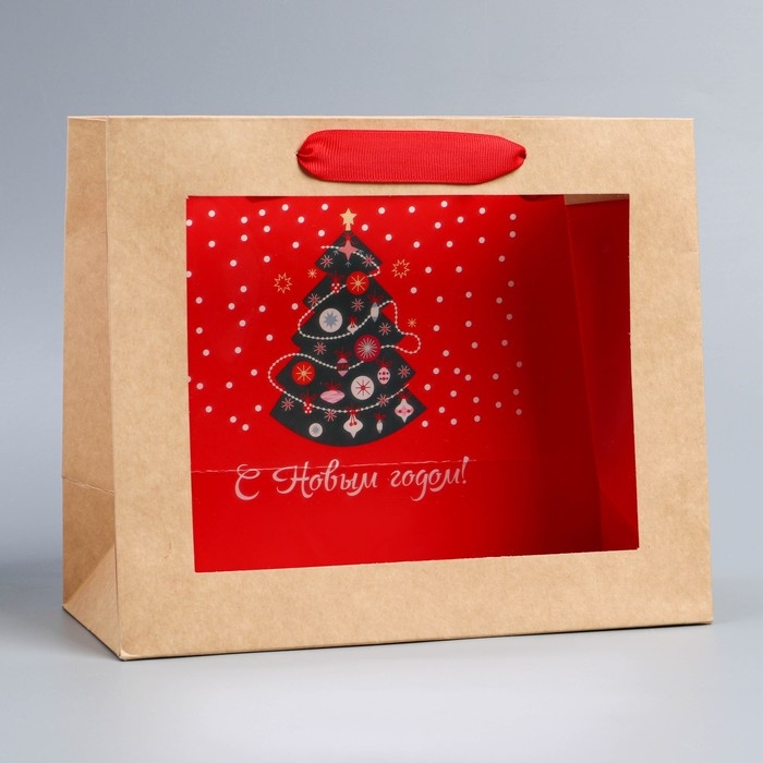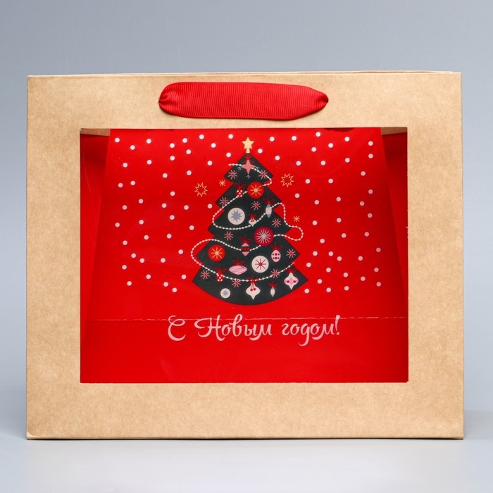 Пакет подарочный новогодний крафтовый с пластиковым окном «Новогодняя ёлка», 24 х 20 х 11см