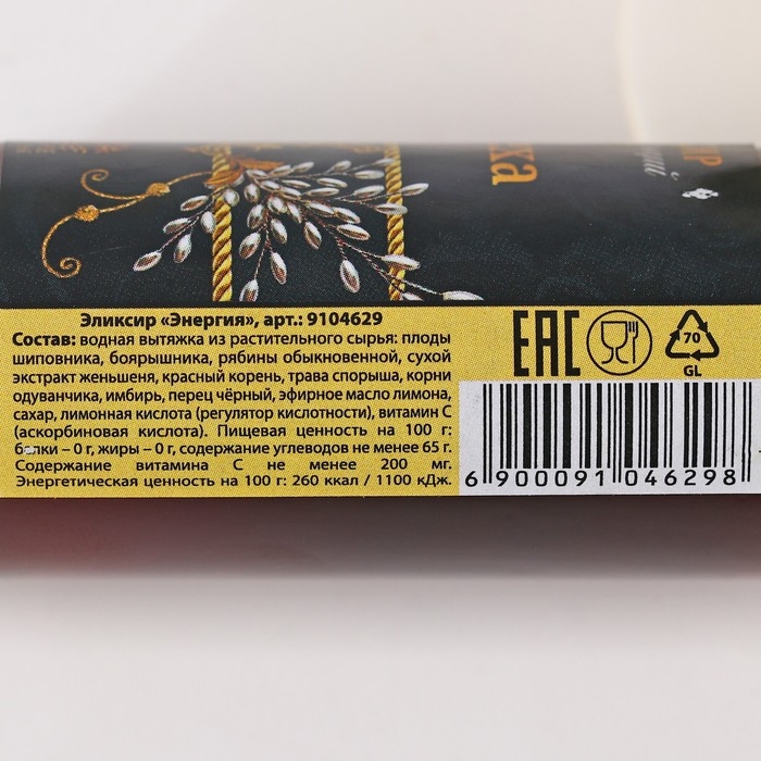 Состав: плоды шиповника, боярышника, рябины обыкновенной, сухой экстракт женьшеня, красный корень, трава спорыша, корни одуванчика, имбирь, перец чёрный, эфирное масло лимона, сахар, лимонная кислота, витамин С.