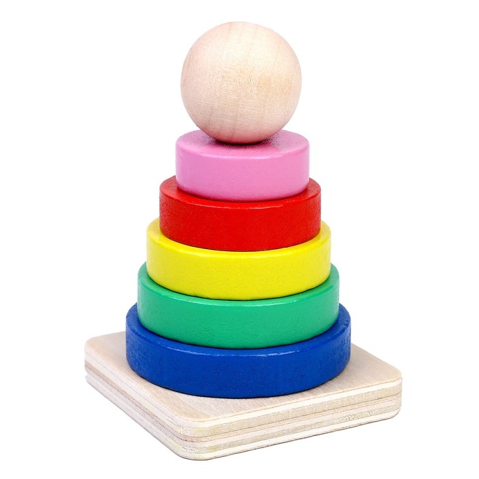 Классическая пирамидка — это одна из первых развивающих игрушек в жизни ребёнка. Задача малыша — правильно расположить кольца на основании, чтобы получилась целая пирамида.