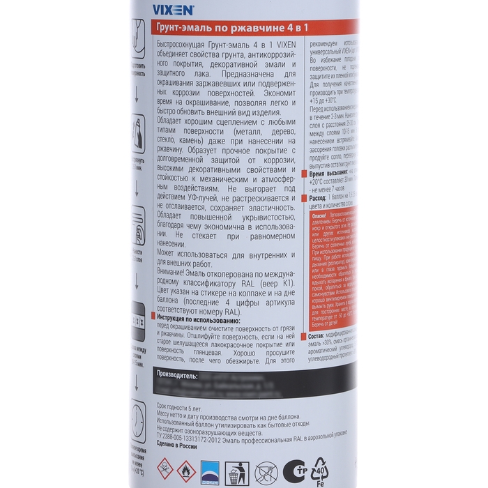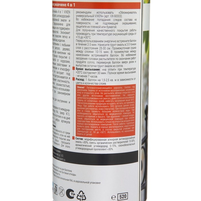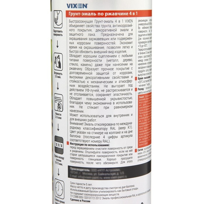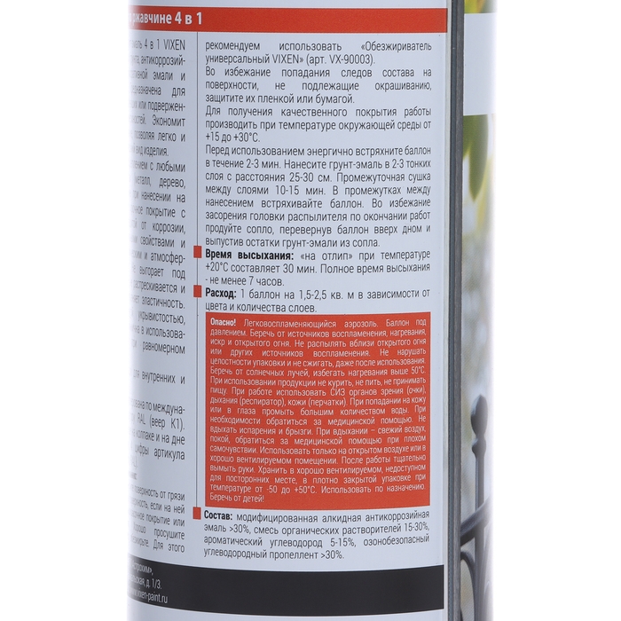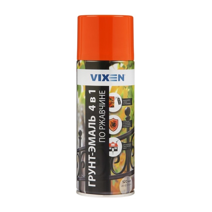 Быстросохнущая Грунт-эмаль по ржавчине 4 в 1 VIXEN объединяет свойства грунта, антикоррозийного покрытия, декоративной эмали и защитного лака. Предназначена для окрашивания заржавевших или подверженных коррозии поверхностей. Экономит время на окрашивание, позволяя легко и быстро обновить внешний вид изделия. Обладает хорошим сцеплением с любыми типами поверхности (металл, дерево, стекло, камень) даже при нанесении на ржавчину. Образует прочное покрытие с долговременной защитой от коррозии, высокими декоративными свойствами и стойкостью к механическим и атмосферным воздействиям. Не выгорает под действием УФ-лучей, не трескается и не отслаивается, сохраняет эластичность. Обладает повышенной укрывистостью, благодаря чему экономична в использовании. Не стекает при равномерном нанесении. Может использоваться для внутренних и для внешних работ.