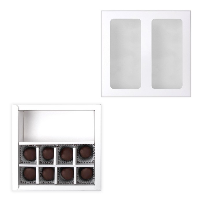 Коробка для 8 конфет + шоколад, с окном, белая, 17,7 х 17,8 х 3,8 см. Кондитерская упаковка