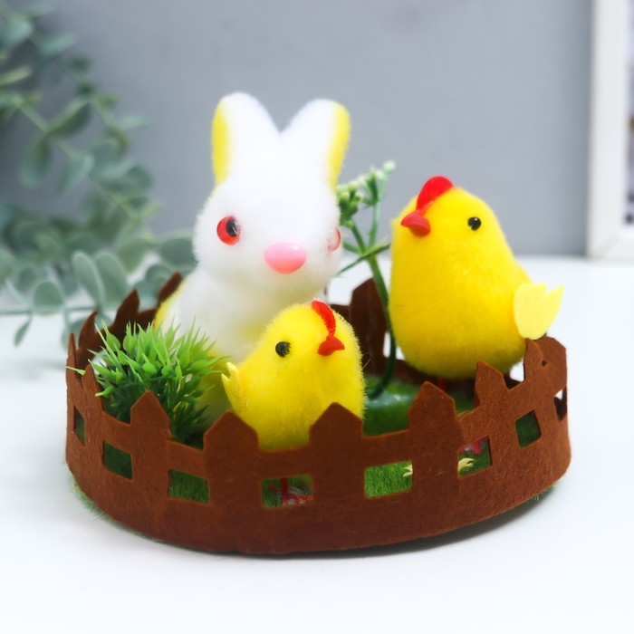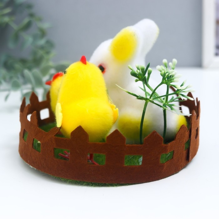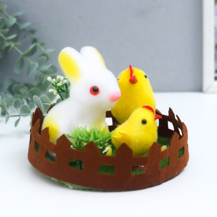 Сувенир пасхальный "Кролик и два цыплёнка на лужайке с цветами" 14х14х10,5 см
