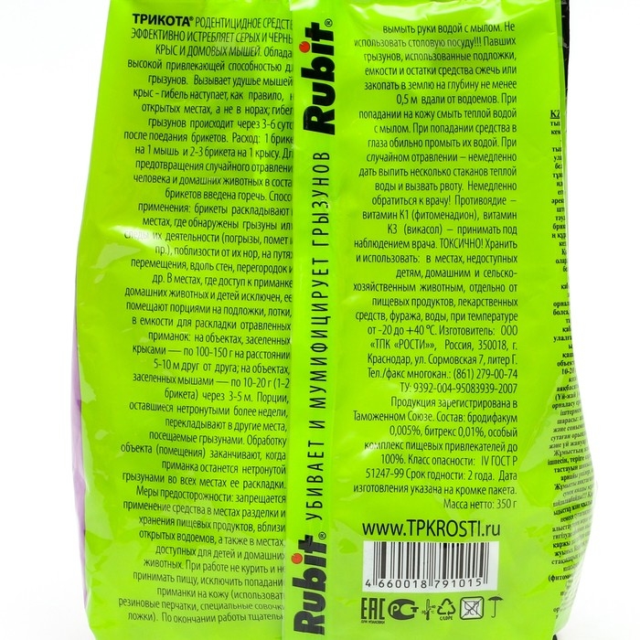 Характеристика: высокоэффективное средство борьбы с мышевидными грызунами - достаточно однократного поедания. Обладает высокой привлекающей способностью для крыс и мышей. Активно даже в отношении грызунов, не чувствительных к другим ядам. Вызывает удушье мышей и крыс - гибель наступает, как правило, на открытых местах, а не в норах. Приманка не вызывает отпугивающего действия и настороженности других особей, т.к. гибель грызунов происходит через 3-6 суток после поедания брикетов.