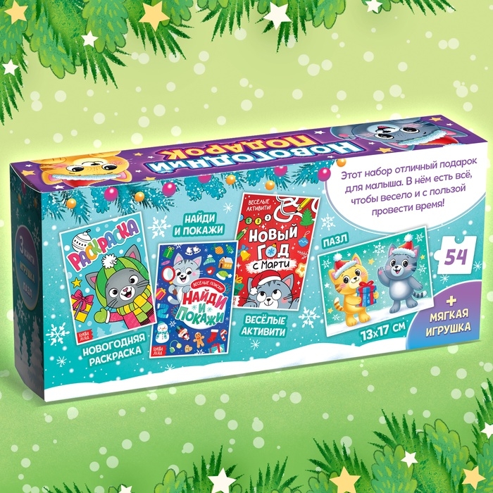 Подарочный набор с тремя книгами, игрушкой и пазлом станет эффектным презентом для малыша. Такой набор подойдёт для индивидуального поздравления дома и для подарков от Деда Мороза в детском саду.