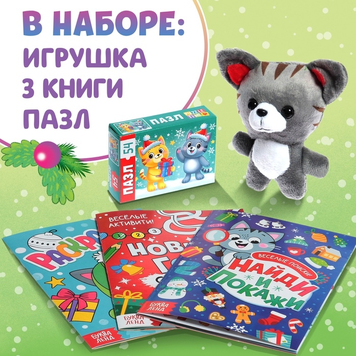 Набор 3 в 1 «Новогодний подарок», 3 книги, игрушка и пазл МИКС