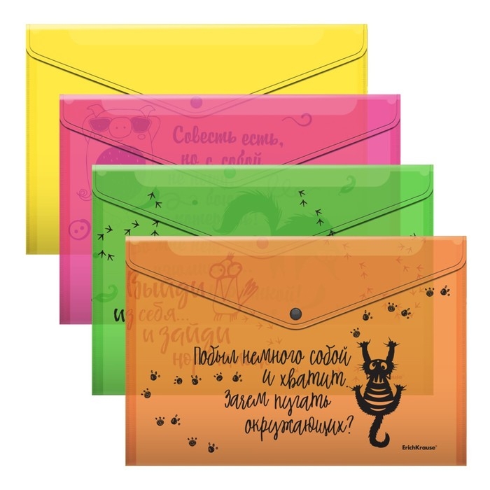 Набор папок-конвертов А4, 160 мкм, ErichKrause Sarcastic Animals, 4 шт., глянцевые, до 120 листов, МИКС