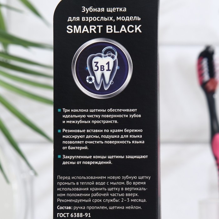Зубная щётка «Смарт» Black средней жесткостиэффективно удалит налёт и очистит полость рта, не травмируя её при этом. Специальные щетинки подстраиваются под контуры зубов, проникают даже в труднодоступные места.